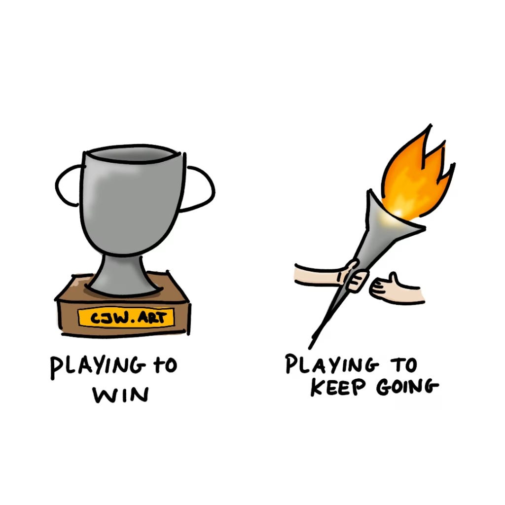 Not sticking to your values: When we see infinite games as a game to win, we naturally optimise for the outcomes that help us “score points”. But it’s all too easy to sacrifice deep values this way. It’s why so many companies will do anything to make more money.